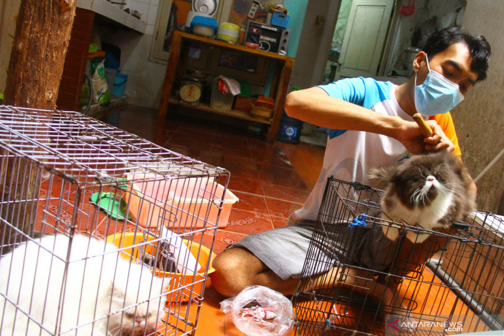 Peternak membersihkan anakan kucing persia yang dibudidayakannya di Gatotkaca Cattery di Malang, Jawa Timur, Jumat (20/7/2021). Peternak kucing setempat mengaku kewalahan memenuhi permintaan yang meningkat dua kali lipat yaitu dari 10 ekor menjadi 20 ekor per enam bulan seiring minat masyarakat yang ingin memelihara hewan tersebut. ANTARA FOTO/Ari Bowo Sucipto/foc.
